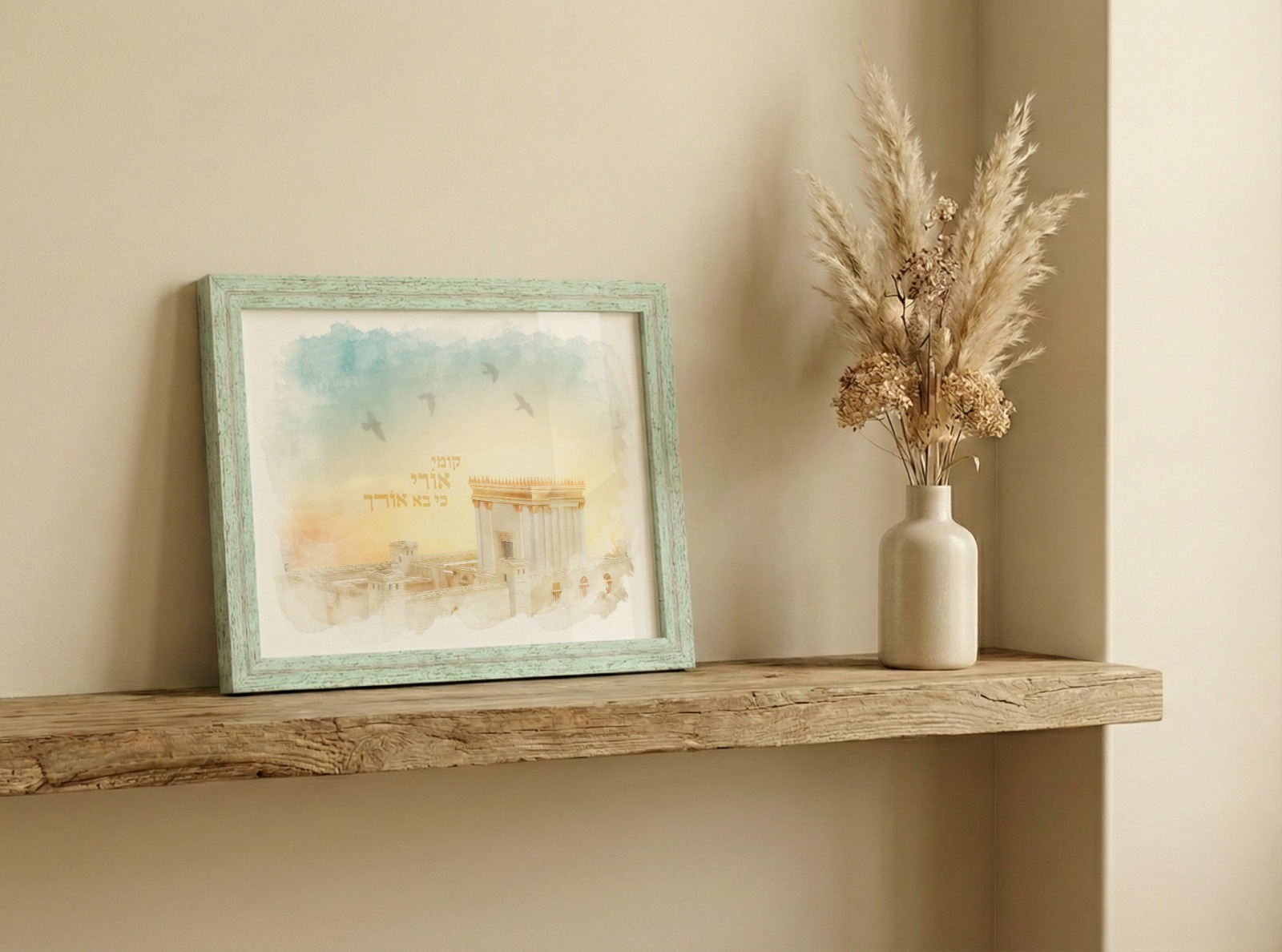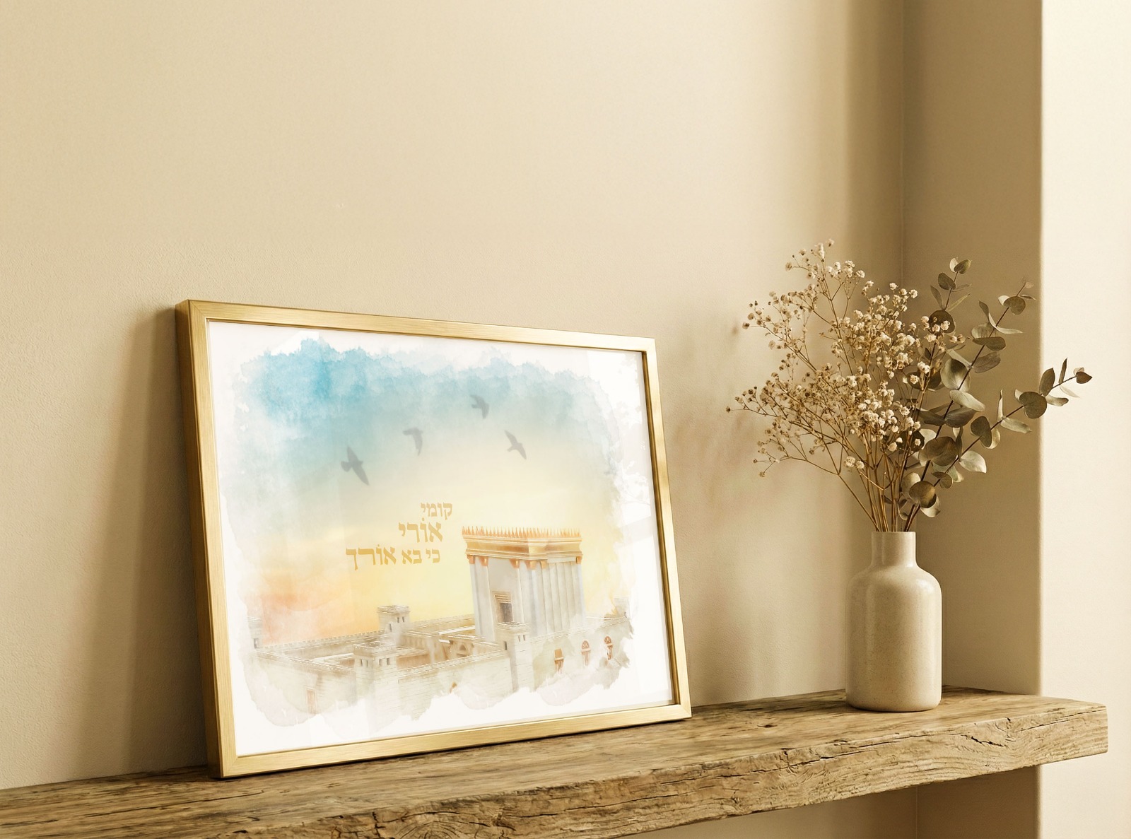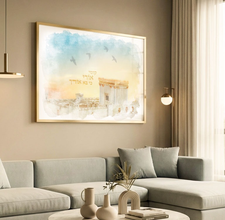 תמונה מהממת של בית המקדש עם כיתוב" קומי אורי כי בא אורך"! התמונה ממוסגרת בציפוי זכוכית.